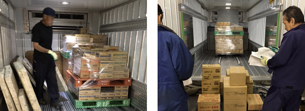 シビアな温度管理が必要なアイスクリーム。しっかりと検品して、荷崩れのないように積んでいきます。